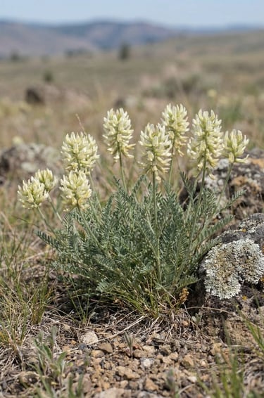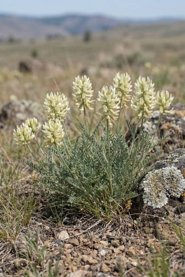Up close, it’s a compact perennial with multiple upright stems and dense, rounded clusters of pea-like blossoms—often creamy-white to pale yellow—set above fine, gray-green, “feathery” leaflets. After peak bloom, the flowers give way to the species’ typical milk-vetch seed pods (legumes), and the plant blends back into the surrounding grasses as the season dries out.