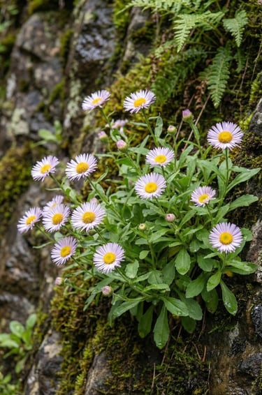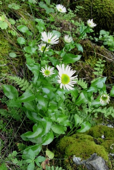 The Columbia Gorge Daisy, sometimes called gorge fleabane, is a Gorge endemic you’ll usually spot in the places most people aren’t looking—tucked into wet, shaded basalt ledges and cliff crevices where seep water keeps the rock face damp. It’s a small perennial (often just a few inches tall) with a bright yellow center and narrow ray petals that can read white to pale pink/purple-tinged, especially in certain light. Because it favors moist cliff habitat and has a very limited range within the Columbia River Gorge, it’s considered rare, and it’s one of those flowers that rewards slow hiking and scanning rock walls rather than staring at the trail.