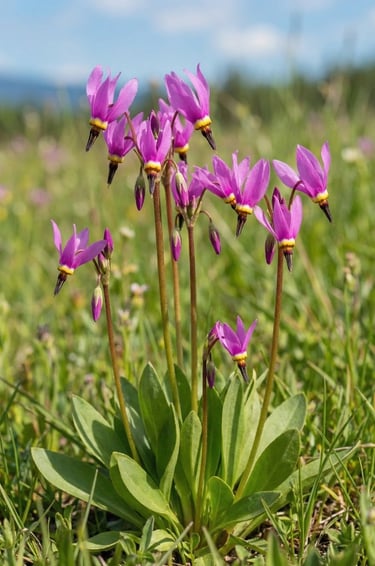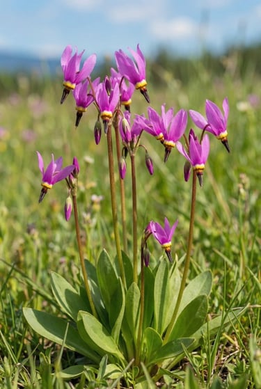 Poet’s Shooting Star is one of those Gorge wildflowers that looks almost unreal up close: five swept-back pink-to-lavender petals flare upward like a little rocket plume, while a tight, pointed cluster of dark purple stamens and a bright yellow “collar” at the petal bases create that classic “shooting star” shape. The blooms hang (nod) from slender stalks above a low rosette of spoon-shaped leaves, so you often spot the color first and then notice the neat green rosette at your feet.