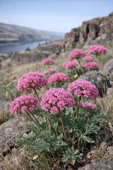 Columbia Desert Parsley is a spring standout in the eastern Columbia River Gorge, sending up clusters of bright pink blossoms from March through May when the landscape is just beginning to green up. It thrives in the Gorge’s dry, open habitats—think sunny slopes, rocky soils, and shrub-steppe edges—where it takes advantage of early-season moisture before summer heat sets in. Up close, the flowers form tight, rounded clusters that make an easy pop of color against the muted tans and sagey greens of the east Gorge. It’s a great plant to watch for on early hikes: you’ll often spot it mixed among other spring wildflowers, adding a vivid pink accent to the basalt-and-bunchgrass scenery