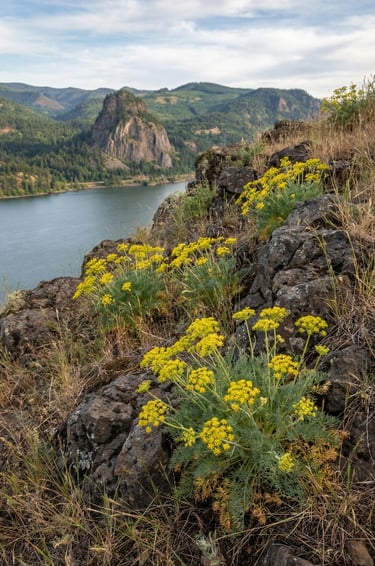 You’ll usually find it on dry, rocky, wind-exposed slopes and basalt bluffs/ridges above the river—exactly the kind of open, sun-baked terrain the Rowena area is famous for. It’s also a special plant regionally: Smooth Desert Parsley is considered endemic to the Columbia River Gorge area (not found naturally anywhere else).