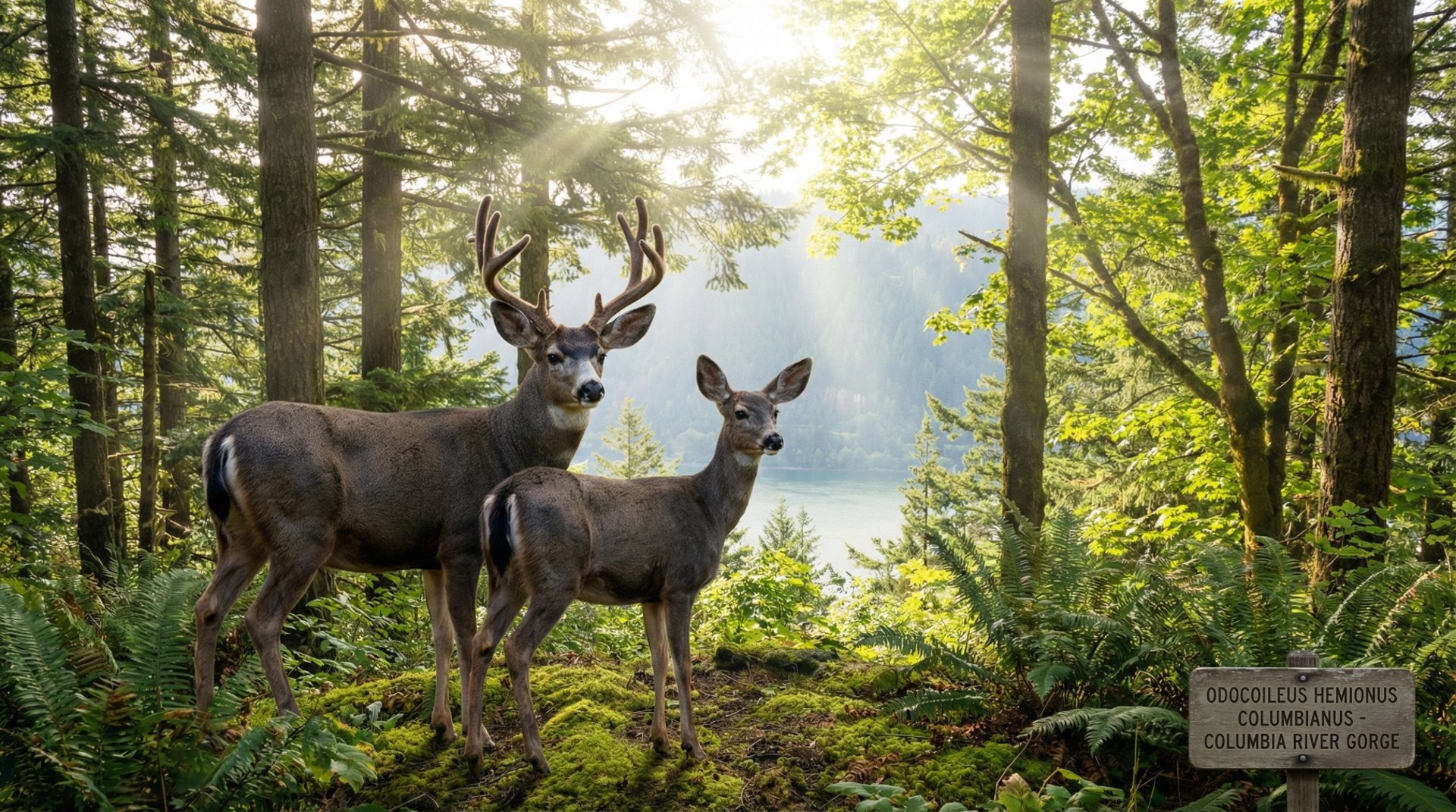 The Gorge's most commonly seen large mammal—a medium-sized deer with a distinctive black-topped tail and reddish-brown summer coat that turns grayish in winter. Bucks grow forked antlers shed each winter. Herbivores that browse on shrubs, grasses, and forbs, they're most active at dawn and dusk but frequently seen midday in shaded areas.